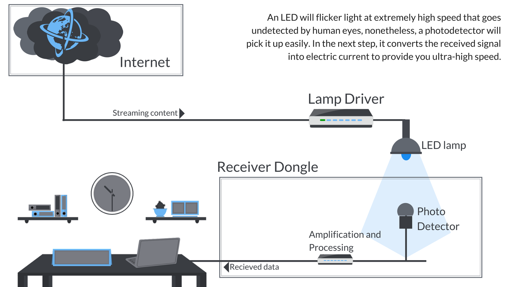 LiFi ย่อมาจากคำว่า Light Fidelity ซึ่งใช้แหล่งพลังงานจากแสงสว่างจากหลอดไฟในการส่งข้อมูลแทนที่คลื่นวิทยุ โดยปกติแล้ว WiFi จะใช้คลื่นวิทยุในการส่งผ่านข้อมูลจาก Router ไปยังอุปกรณ์ต่าง ๆ ที่อยู่บริเวณนั้น ส่วนหลักการทำงานของ LiFi จะเป็นการใช้กระพริบถี่ ๆ ของหลอดไฟ LED ในความรวดเร็วที่เราไม่สามารถมองเห็นได้ด้วยตาเปล่า ซึ่งรูปแบบของข้อมูลจะส่งผ่านในรูปแบบของค่าความสว่าง (Amplitude) และอุปกรณ์ต่าง ๆ ภายใต้แสงไฟนั้นก็จะสามารถรับสัญญาณ LiFi ได้